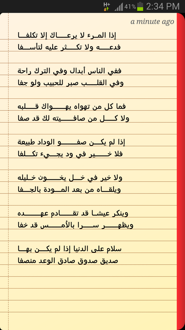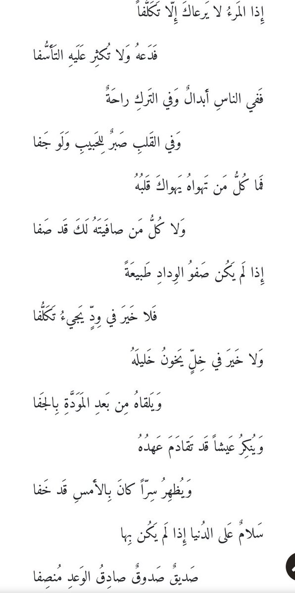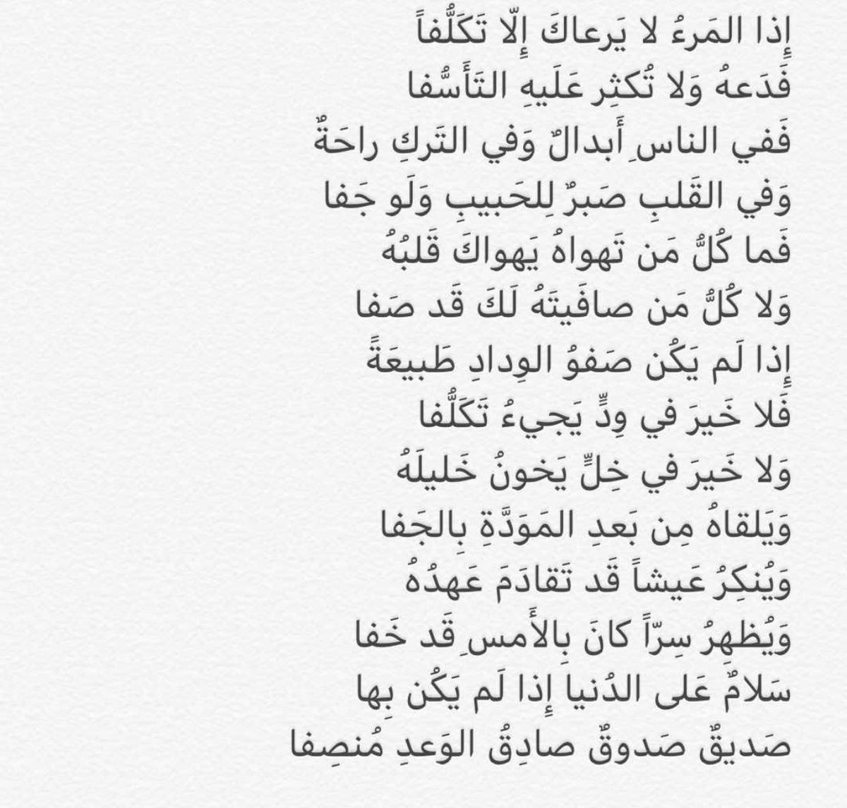 اذا المرء لا يرعاك الا تكلفا تويتر. إ ذا الم رء لا ي رعاك إ ل ا ت ك ل فا ف د عه و لا ت كث ر ع ل يه الت أ س فا. إذا المرء لا يرعاك إلا تكلفا. إ ذا الم رء لا ي رعاك إ ل ا ت ك ل فا ف د عه و لا ت كث ر ع ل يه الت أ س فا ف في. إ ذا الم رء لا ي رعاك إ ل ا ت ك ل فا ف د عه و لا ت كث ر ع ل يه الت أ س فا ف ف ي الن اس أب د ال و في الت ر ك ر احة وفي القلب صبر للحبيب ولو جفا ف م ا ك ل م ن ت ه و اه ي ه و اك قلبه و لا كل.